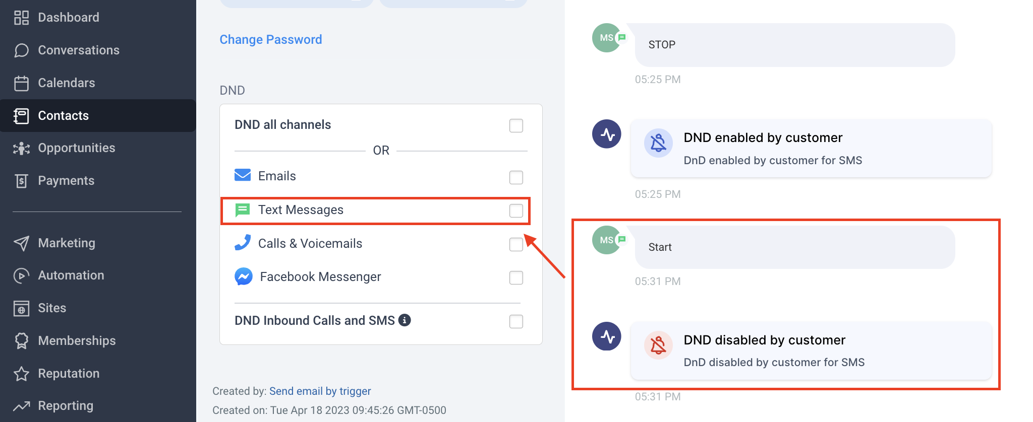 💡 When a contact unsubscribes from automated messages by responding "stop," it triggers a permanent Do Not Disturb (DND) for text messages until the contact resubscribes by replying "start." Including an opt-out message in the first communication is mandatory to maintain compliance. You can still email and call if they opt out of text messages.